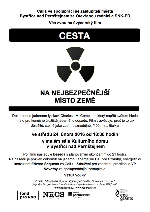 Po filmu následovala beseda s odborníkem na jadernou energetiku Daliborem Stráským, energetickým konzultantem Edvardem Sequensem za Callu – Sdružení pro záchranu prostředí a Vítem Novotným za spolupořádající zastupitele.