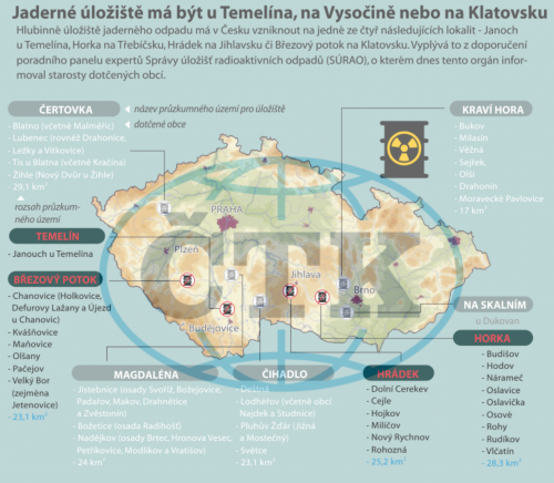 Dosud se v souvislosti s úložištěm uvažovalo o devíti lokalitách, zúžení na čtyři místa už v červnu schválila Rada Správy úložišť radioaktivních odpadů (SÚRAO). Ministr průmyslu a dopravy Karel Havlíček (za ANO) minulý týden ČTK řekl, že proces výběru čtyř lokalit zhodnotil pozitivně Státní úřad pro jadernou bezpečnost a stejně tak externí nezávislá oponentura, kterou si v mezidobí MPO nechalo zpracovat.
