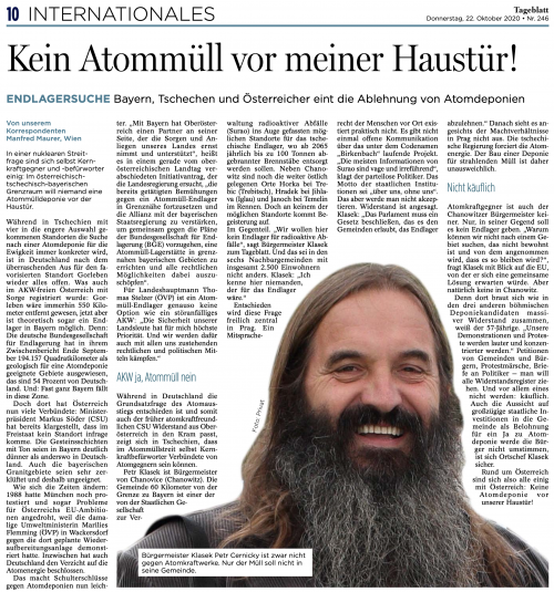Zatímco v České republice se stává hledání místa pro úložiště stále konkrétnější vzhledem k tomu, že se počet uvažování lokalit v polovině roku zúžil na čtyři, v Německu zůstávají po vyloučení dřívějšího favorita – lokality Gorleben – opět všechny možnosti otevřené. Co ale Rakušané sledují s velkými obavami, je fakt, že Gorleben byl od rakouských hranic vzdálen 550 km, zatímco nyní je možné, že nové úložišťové lokality v Německu budou mnohem blíže, například v Bavorsku. Protože Německá spolková agentura pro konečné skladování koncem září zveřejnila svou zprávu, podle které je pro budoucí stavbu jaderného úložiště geologicky vhodných více než 54 % plochy Spolkové republiky Německo. A co se týká Bavorska, tak to do tohoto geologicky vhodného území patří téměř celé.
