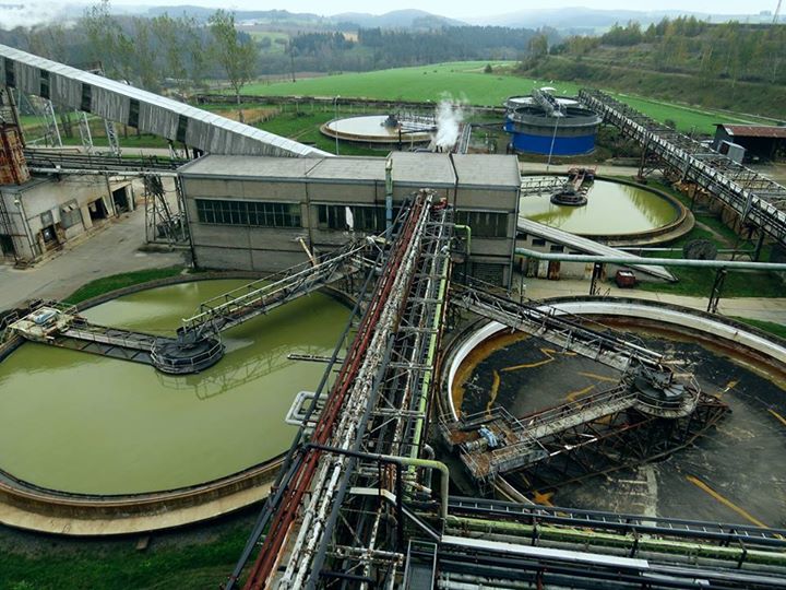 Po těchto prezentacích nás čekala prohlídka chátrající budovy z roku 1956 (kde jsme se proplétali mezi kontejnery plných nebezpečných zapáchajících chemických sloučenin), zastavili jsme se v nové budově z roku 2007 plné automatizovaného zařízení (a bez zápachu) a vystoupili k odkališti, jehož břehy jsou osázené fotovoltaickými panely, údajně ve vlastnictví firmy Sky Solar.