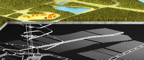 Zkoumaný prostor se rozkládá na jednadvaceti kilometrech čtverečních a zasahuje tak na území celkově šesti obcí, mezi kterými má vyrůst nadzemní areál o velikosti dvaceti fotbalových hřišť. Jde přitom o pouhý zlomek toho, co je v plánu postavit pod povrchem. V hloubce pěti set metrů má vzniknout síť podzemních tunelů pro ukládání radioaktivního odpadu o celkové délce sta kilometrů. Pro srovnání, součet všech tras pražského metra měří pětašedesát kilometrů a nejníže položená stanice leží jen padesát tři metrů pod zemí.
