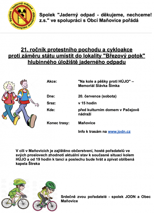 Sraz je v sobotu 20. července v 15:00 v Pačejově-nádraží před kulturním domem. Letos už se konaly na Horažďovicku dva protesty proti úložišti – začátkem ledna pochod v Chanovicích a v dubnu ve Velkém Boru na hlavní silnici z Plzně na Horažďovice, kudy projíždí denně 15.000 aut.