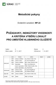 Cílem tohoto Metodického pokynu Správy úložišť radioaktivních odpadů MP.22, který v této třetí verzi platí od 1. 12. 2017, je shrnout požadavky, indikátory vhodnosti a kritéria, podle kterých bude vybírána lokalita pro hlubinné úložiště. Již v roce 2018 podle něj mají být vybírány lokality do další etapy geologických průzkumů.