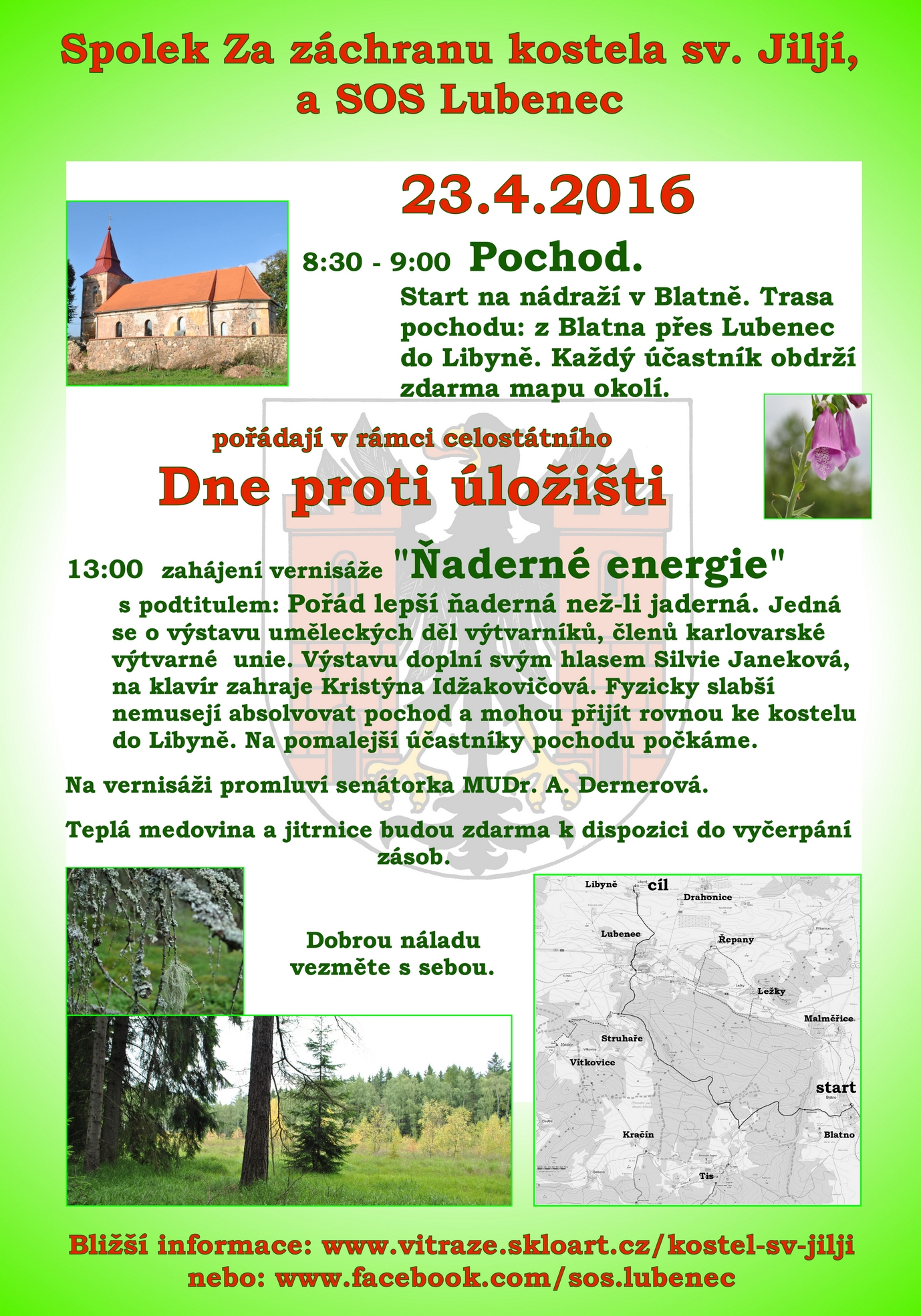 Účastníci pochodu se po třinácté hodině sešli v kostele sv. Jiljí v Libyni , kde paní senátorka a Jitka Kantová zahájily výstavu obrazů s názvem "Lepší ňaderná, nežli jaderná energie". V rámci vernisáže proběhl koncert mladých hudebníků a následně i ochutnávka jídel , zákusků, jitrnic a jelítek a samozřejmě i medoviny a dalších nápojů, které připravily lubenecké ženy a sponzoři.